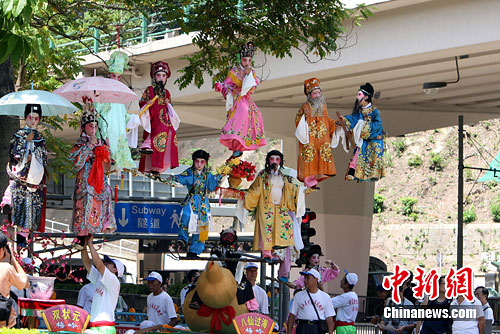 图为著名的广东梅岭飘色队伍吸引途人观赏。中新社发 洪少葵 摄