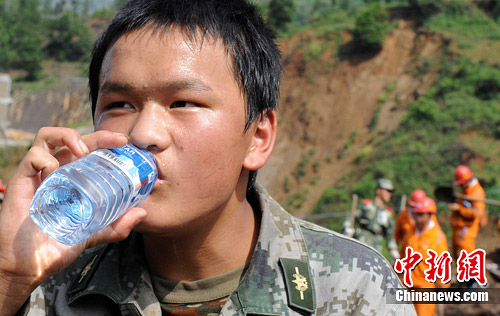中新网贵州关岭7月1日电 (记者 曹多然) 1日,贵州关岭滑坡灾害搜救现场气温骤升,高照的烈日和难耐酷热。高温暴晒下,一线搜救官兵的衣衫已全部湿透。贵州关岭滑坡现场抢救组副组长叶文邦称,大量出汗使官兵们的体力消耗严重,现场消毒要求也相应提高。目前,救援指挥部正在大量补充饮水供应。