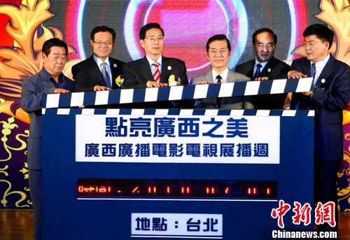 7月1日下午,“2010年桂台经贸文化合作论坛”系列活动之一的“广西广播电影电视展播周”,在台北市圆山大饭店举行启动仪式,中共广西壮族自治区委员会书记郭声琨参加启动仪式。期间将推出广西广播节目展播、广西电视节目展播,同时上映《寻找刘三姐》、《清水的故事》、《圆明园》三部影片。中新社发 宋吉河 摄