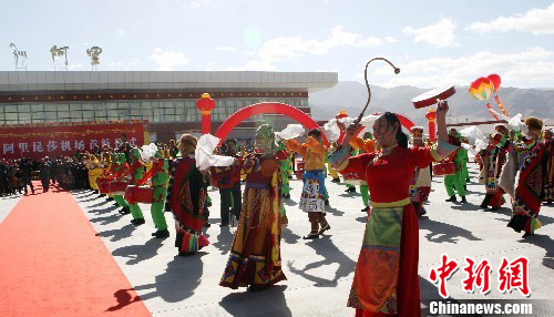 西藏阿里昆莎机场7月1日顺利实现首航,填补了藏西北民航交通的空白。在当日举行的首航仪式上,阿里民众身着节日盛装,载歌载舞。