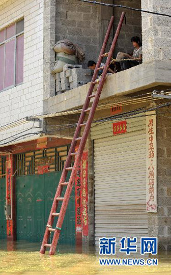 7月1日,在广西凌云县逻楼镇,两名学生在洪水围困的楼房上复习功课。周华 摄