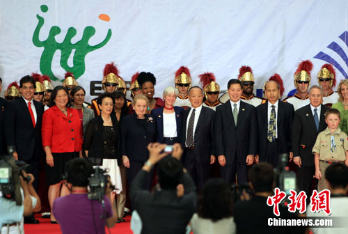 7月2日,上海世博会美国国家馆日庆典仪式在世博中心举行,美国前国务卿奥尔布赖特(左四)和全国人大外事委员会主任委员李肇星(左六)出席并合影留念。中新社发 潘索菲 摄