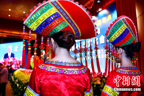7月2日下午,“2010年桂台经贸文化合作论坛”在台北圆山大酒店举行,会议礼仪小姐身着广西少数民族服饰引人注目。中新社发 宋吉河 摄