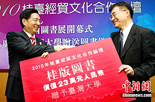 “2010年桂台经贸文化合作论坛”系列活动陆续在台湾展开,7月2日,广西图书展在台湾大学开幕,中共广西区委书记郭声琨出席并向台湾大学赠书。中新社发 宋吉河 摄