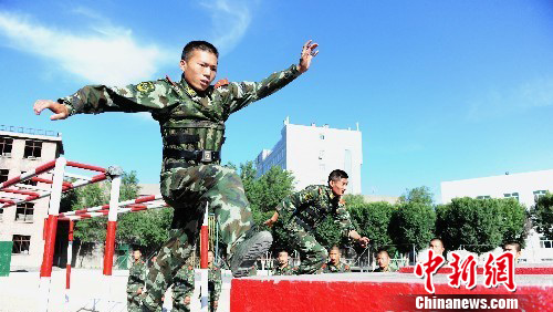 7月2日下午,驻新疆维吾尔自治区武警某部战士顶着太阳、身负沙袋进行训练。中新社发 侯宇 摄