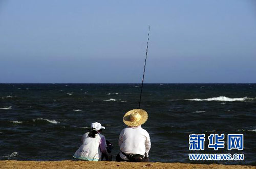7月3日,游人在海南琼海博鳌海滨垂钓。蒙钟德 摄