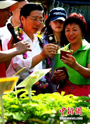 广西自治区党委书记郭声琨,7月4日在台湾彰化县一家经营花卉产业参访。中新社发 宋吉河 摄