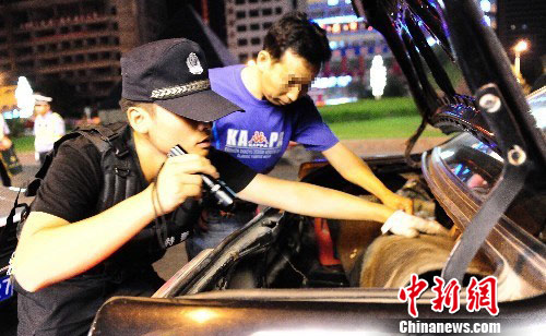 7月4日凌晨,新疆维吾尔自治区交警与特警协同合作,在乌鲁木齐市部分路段设置查车点,抽查过往车辆,确保城市安全。中新社发 侯宇 摄