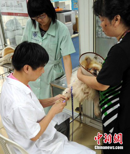 7月4日,福建福州高温酷暑。一只因高温中暑的宠物犬在市区一家动物医院接受挂瓶治疗。福建省气象台继续发布高温橙色预警信号:受副热带高压控制,4日福建省南平南部、三明东部、龙岩东部、福州西部、漳州中北部、泉州西部、宁德中部可达37℃~38℃,局部超过39℃。刘可耕 摄