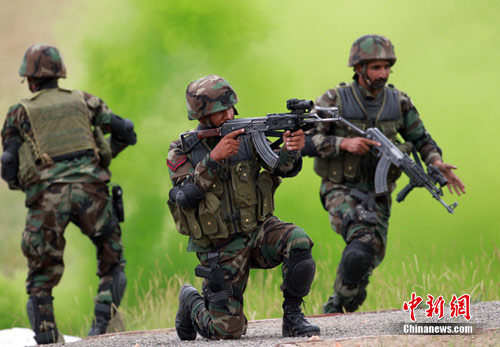 7月4日,“友谊—2010”的中国巴基斯坦反恐联合训练在中国宁夏青铜峡地区展开,此次训练主要以边境地区山地联合反恐作战为课题,分为展示交流、混编同训、综合演练三个阶段。图为反人质劫持演练。中新社发 杜洋 摄