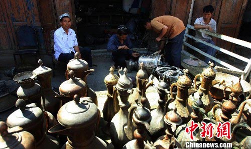 7月4日,新疆莎车县手工艺一条街,一处维吾尔手工铜制品作坊,维吾尔族民间手工艺人正在一堆铜壶后,精心雕刻一款大型铜制品的花纹图案。
