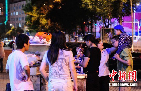 7月4日深夜,新疆维吾尔自治区首府乌鲁木齐市街头,一些市民在街头的小吃摊购买夜宵。中新社发 侯宇 摄