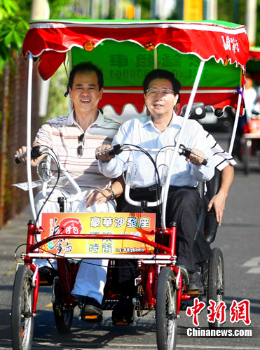 在台湾参访的广西自治区党委书记郭声琨,7月5日早上在彰化县一景区骑脚踏车观光,体验绿色交通方式的游览感受。中新社记者 宋吉河 摄