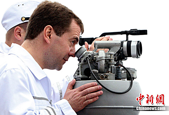 图为梅德韦杰夫在“彼得大帝”号上使用舰载设备。