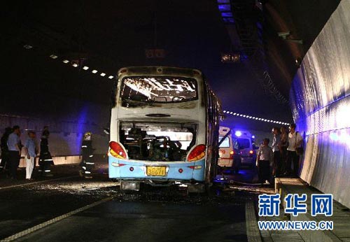 无锡惠山隧道拍摄的客车起火事故现场。 程炳洪 摄