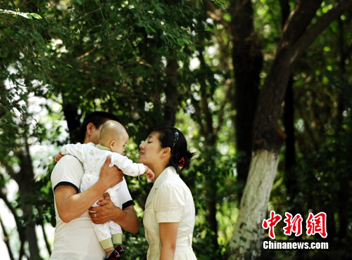 7月5日午间,新疆维吾尔自治区首府乌鲁木齐市红山公园,一家三口在此游玩,其乐融融。中新社发 侯宇 摄