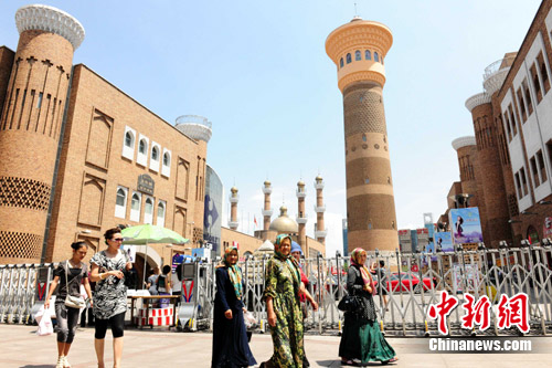7月5日,民众在新疆维吾尔自治区首府乌鲁木齐市著名的国际大巴扎前参观购物。中新社发 侯宇 摄