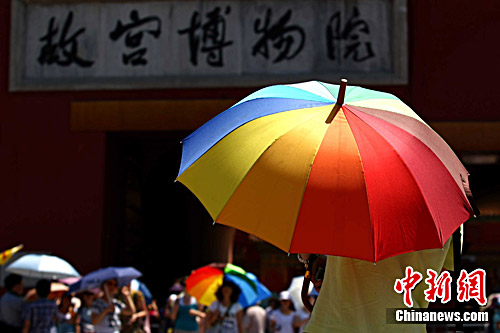 图为北京故宫博物院门前游人打着阳伞。中新社发 富田 摄