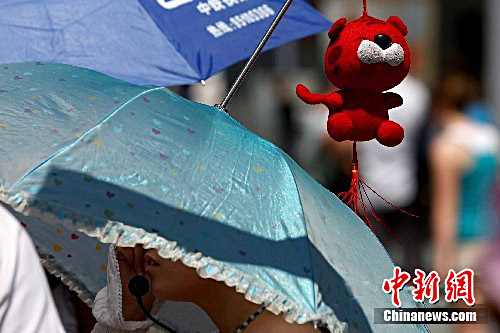 图为路人纷纷打开阳伞。中新社发 富田 摄