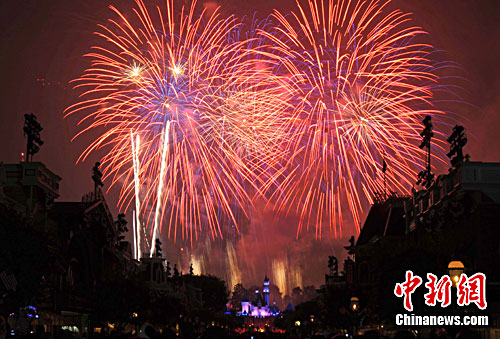 7月4日是美国独立纪念日。当晚,数万民众聚集在加州迪士尼乐园观看礼花绽放夜空的绚丽景象。