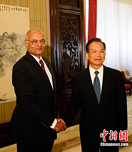 7月5日,国务院总理温家宝在北京中南海会见印度特使、国家安全顾问梅农一行。中新社发 任海霞 摄