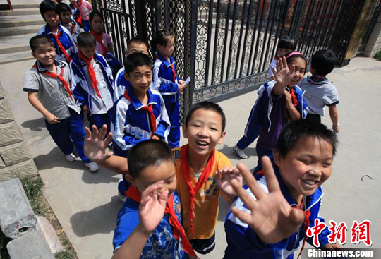 7月5日中午,正值新疆喀什市第四小学放学时间,准备各自回家吃中饭的中学生列队走出校门时,友好向记者的镜头打招呼。