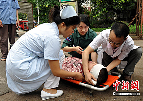 120急救医护人员现场演练抢救“伤员”。达消轩 摄
