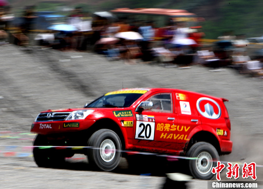 7月5日,2010全国汽车越野系列赛(CCR)东川站暨中国云南东川泥石流越野赛进入第四天比赛,长城汽车东方赛车队江惠坚与领航员王天云密切配合驾驶长城哈佛赛车乘风破浪,遥遥领先其他选手。中新社发 赵振清 摄