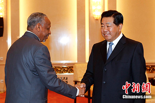 7月6日,中共中央政治局常委、全国政协主席贾庆林在北京人民大会堂会见了由副主席纳菲阿·阿里·纳菲阿率领的苏丹全国大会党代表团。中新社发 盛佳鹏 摄