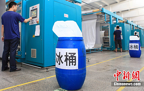 中央气象台7月6日10时发布高温橙色预警,华北大部、黄淮大部、江淮东部和北部以及湖北北部、陕西东部和中南部、甘肃西北部、内蒙古中西部的部分地区有35~38℃的高温天气,其中,北京中南部、河北中南部、山东西北部、河南北部等地的部分地区最高气温可达40℃左右。江南南部、华南大部也将有35~37℃的高温天气。图为山东即墨市企业用冰桶防暑降温。中新社发 梁孝鹏 摄