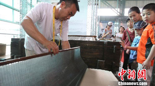 7月6日,来自江西的民间艺人在上海世博园宝钢大舞台为大家展示中国古代的造纸工艺,吸引了众多游客好奇的目光。中新社发 汤彦俊 摄
