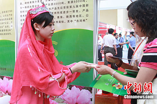 7月6日,“兰洽会”举行,甘肃临夏回族自治州姑娘向参观者推介。中新社记者 殷春永 摄