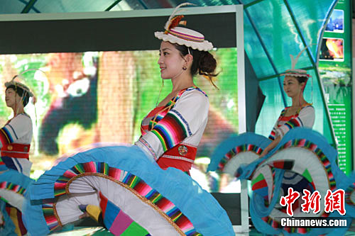 7月6日,“兰洽会”举行。甘肃陇南市展区献演白马藏族舞蹈。中新社记者 殷春永 摄
