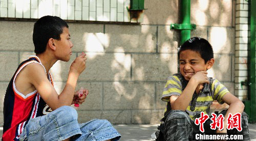 7月6日上午,新疆维吾尔自治区首府乌鲁木齐市街头,两名少年正吹泡泡嬉戏。中新社发 侯宇 摄