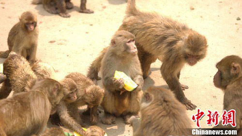 7月6日,河南郑州市动物园内,猴子挣吃清凉西瓜避暑。当日,河南省气象台发布高温橙色预警,多地气温逼近38℃。郑州动物园为应对炙热高温天气,采取空调、淋浴、补充水果饮食等措施给动物降温。中新社发 王中举 摄