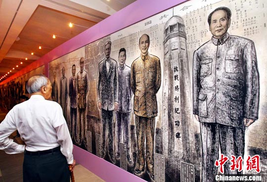 7月6日,由四川50余名画家历时5年共同创作的巨型长卷史诗国画在台北“国父纪念馆”完整展出。展品全长840公尺、面积18558平方公尺,画中人物近千名,其中包括40余名台湾抗日英烈。画卷分为《山河岁月》、《精神堡垒》、《血肉长城》、《信义和平》、《晴天碧海》、《千岛图》等主题、是第一幅全方位、多角度、全景式表现中国抗日战争全貌的中国画作品。