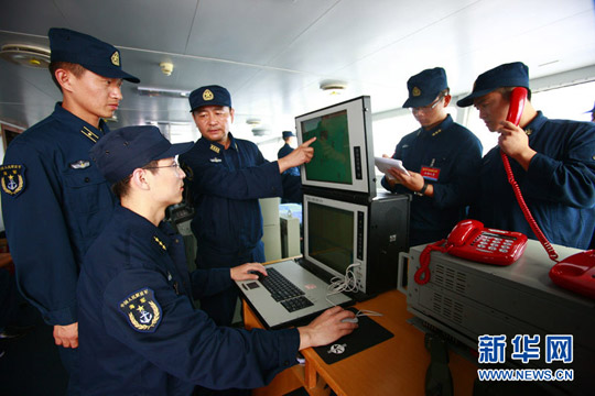 图为参加实兵演练的海军官兵在认真分析海上作战态势。查春明 摄