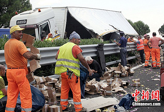 运钞车侧翻 200万欧元铺满公路被哄抢(2)
