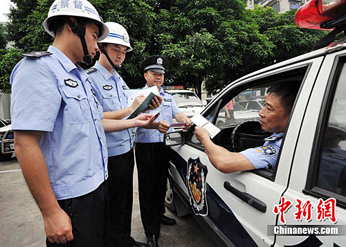6日,民警对所有的首批机关警车从外观标识到民警着装随带驾驶证、行驶证等证件进行全面检查验收。徐建峰 摄