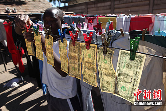 7月6日,在津巴布韦首都哈拉雷,人们将美元放置在洗衣机内清洗后晾干。把美元放到洗衣机内转45分钟,就可以取出崭新的纸币了。自从去年津巴布韦自己的货币恶性通货膨胀后,美元就成了他们的流通货币。