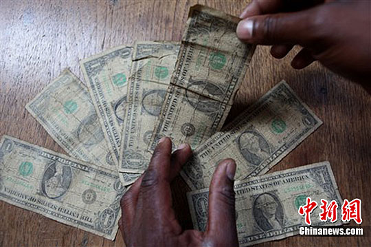 哈拉雷的一名男子在清洗美元纸币前仔细清点。