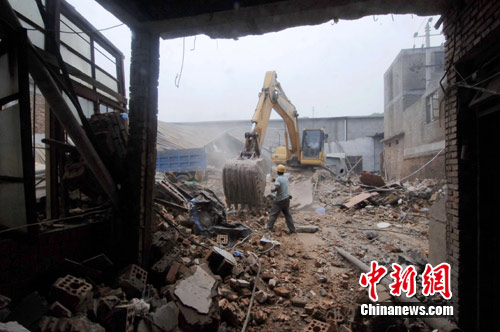 7月7日,工人仍在倒塌的宅基地上进行废墟清理。6日傍晚,福州仓山城门镇下董自然村发生民宅倒塌事故,13名外来务工人员被压,其中3人当场死亡,10名被救出者1人伤情危重正在抢救中,9人生命体征尚平稳。 中新社发 王东明 摄
