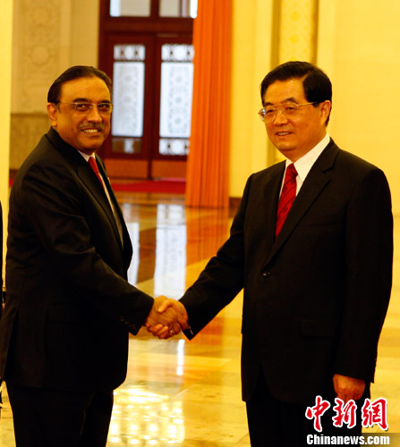 七月七日,国家主席胡锦涛在北京人民大会堂会见巴基斯坦总统扎尔达里并举行会谈及共同出席两国合作协议签字仪式。