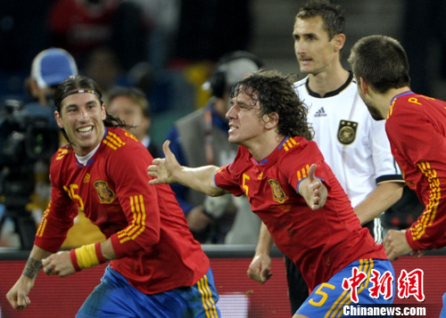 北京时间7月8日凌晨2:30,南非世界杯第二场半决赛在德班球场拉开战幕,由德国队迎战西班牙。凭借普约尔在第73分钟的头球破门,西班牙队1-0力克德国,与荷兰队会师决赛。