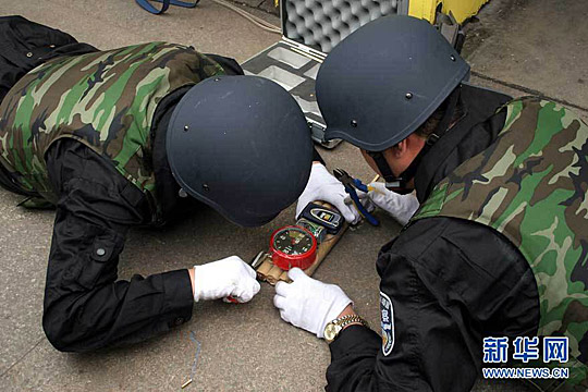 山西太原铁路公安处特警在突发事件应急演练中处置“爆炸装置”。梁敬 摄