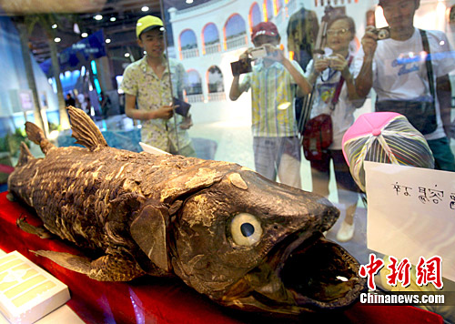 7月8日,在世博非洲联合馆展出的科摩罗腔棘鱼标本,吸引了众多游客的“眼球”。作为世界上最古老的鱼种,腔棘鱼出现于3.5亿年前,它不但能呼吸空气,还能用鳍来当作脚走路,这也是鱼类向两栖类进化的重要证据。腔棘鱼也被称为“恐龙时代的活化石”。此次在非洲联合馆科摩罗展馆展出的长达1.2米的腔棘鱼标本,是科摩罗总统1997年赠送给中国国家元首的珍贵礼物,之后一直被存放在北京自然博物馆中展出。中新社发 汤彦俊 摄