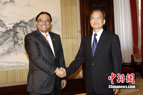 7月8日,中国国务院总理温家宝在北京中南海紫光阁会见了巴基斯坦总统扎尔达里。 中新社发 盛佳鹏 摄
