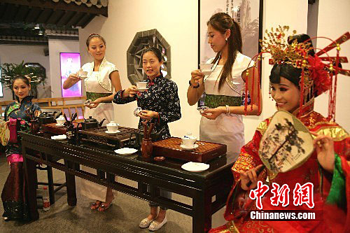 图为参加2010年世界旅游小姐年度冠军总决赛的参赛选手在黄山徽州茶苑学习茶艺展示。中新社发 赵隽 摄