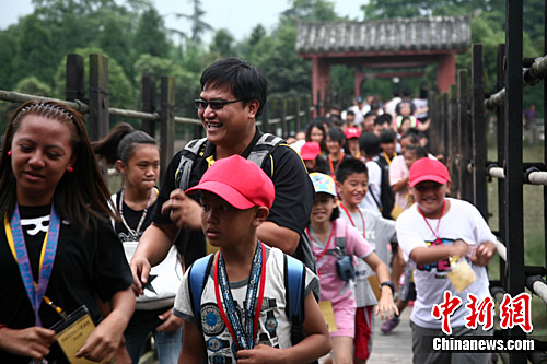 7月8日,由台湾少数民族民意代表高金素梅率领的由台湾“8.8”风灾灾区民众组成的参访团抵达四川地震灾区都江堰,在这里台湾风灾灾区儿童亲眼目睹了世界遗产都江堰水利工程。图为台湾灾区儿童在都江堰水利工程的索桥上经过。中新社发 张浪 摄
