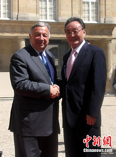 当地时间8日中午,正在法国进行正式友好访问的中国全国人大常委会委员长吴邦国在卢森堡宫与法国参议院议长拉尔谢举行会谈。中新社发 张蔚然 摄